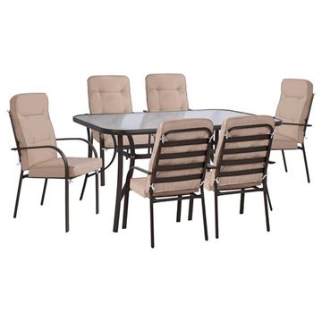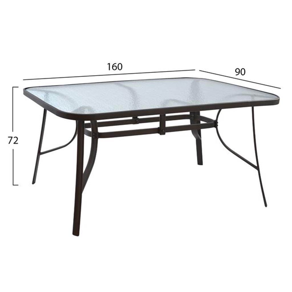 Ένα τραπέζι μεταλλικό εξωτερικού χώρου σε καφέ απόχρωση, με ενσωματωμένο τζάμι ασφαλείας (secure).