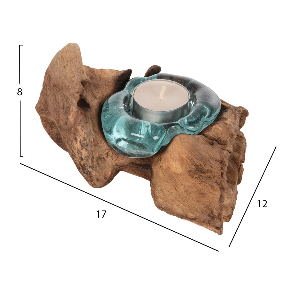Το επιτραπέζιο διακοσμητικό HM4283 είναι μια βάση για 1 κεράκι ρεσό κατασκευασμένη από μασίφ ξύλο ΤΕΑΚ. Η βάση για τo ρεσό είναι από γυαλί. Οι οπαδοί του ρουστίκ στυλ στην διακόσμηση θα ενθουσιαστούν με αυτή την πρόταση.