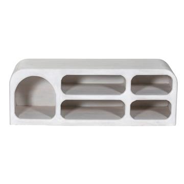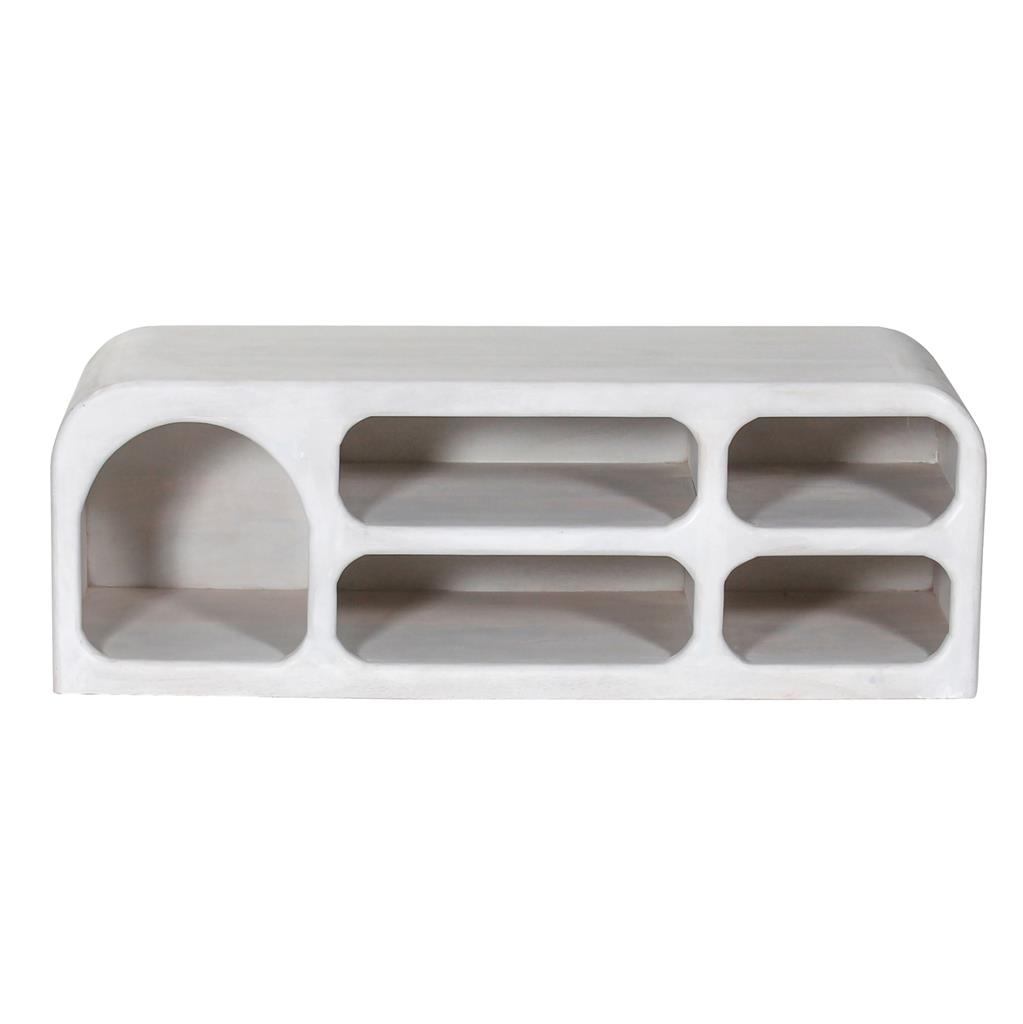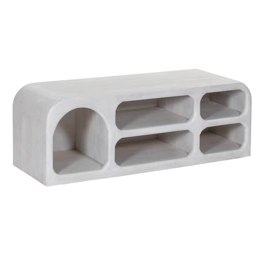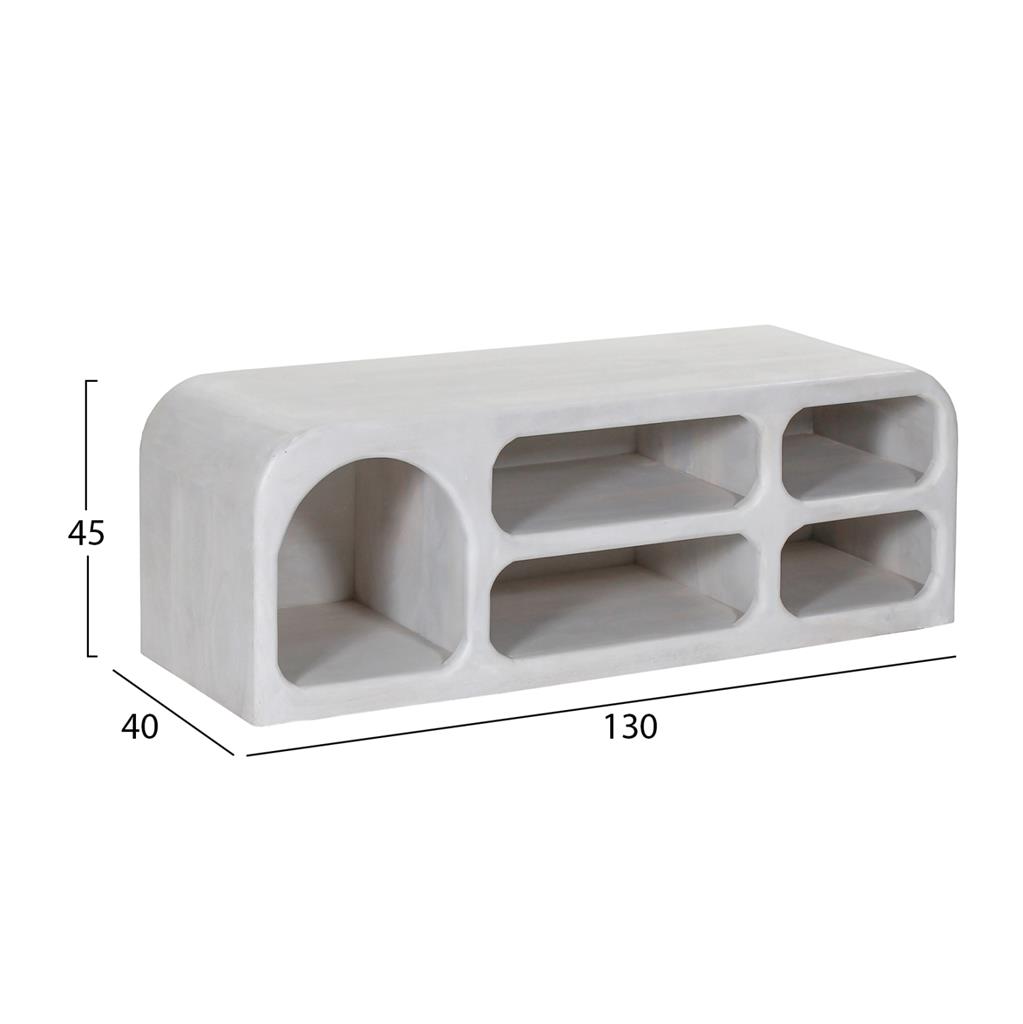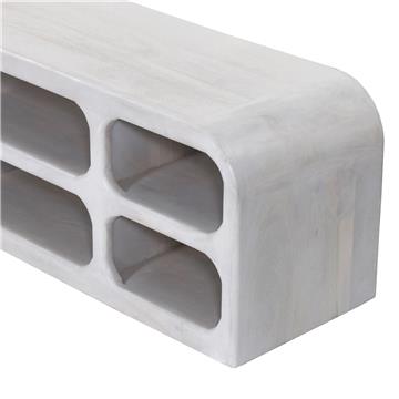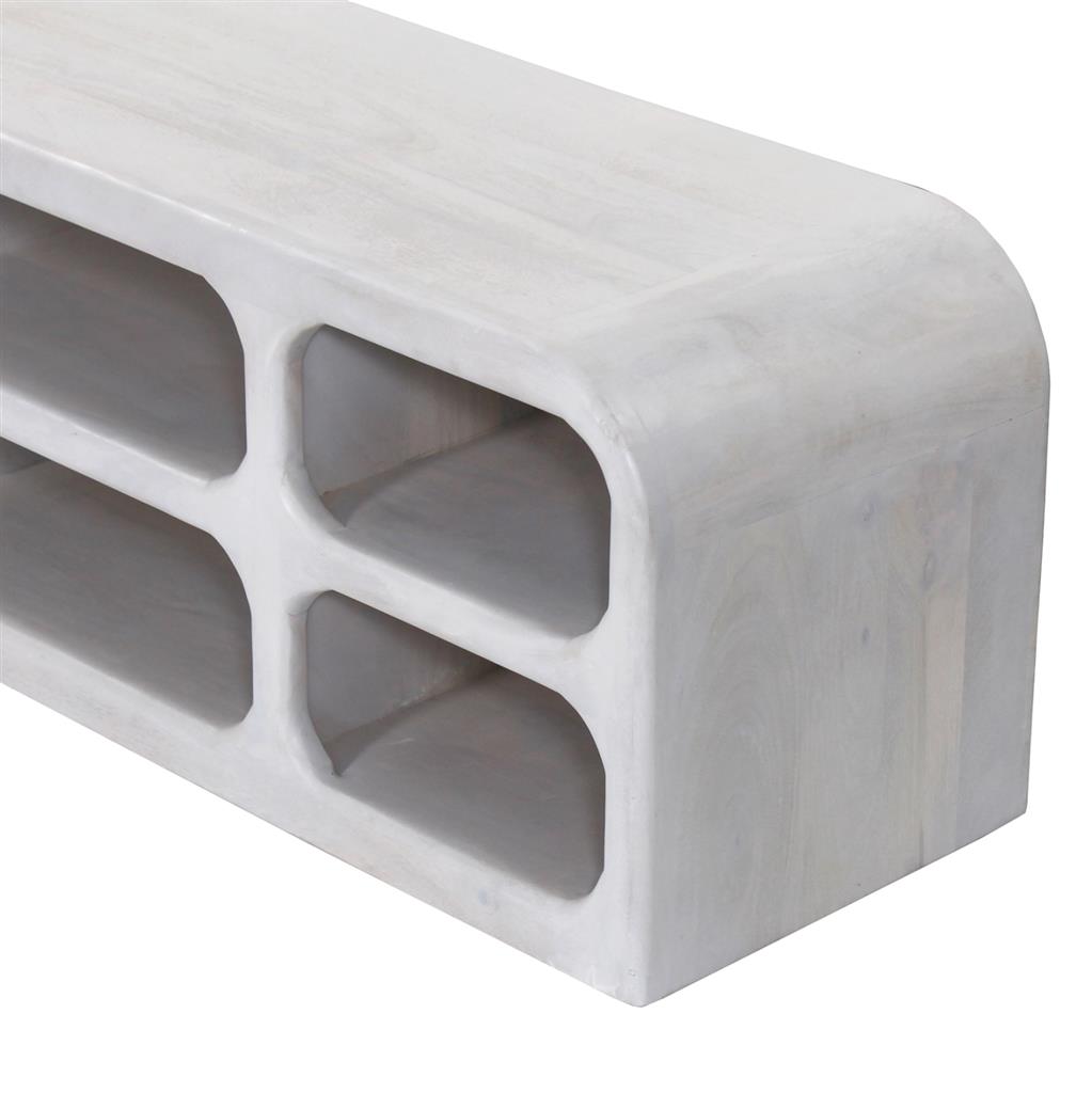 Το έπιπλο τηλεόρασης HANDYR είναι εξολοκλήρου κατασκευασμένο από μασίφ ξύλο mango σε ΛΕΥΚΟ χρώμα. Οι γωνίες και οι άκρες είναι στρογγυλεμένες ενώ διαθέτει 5 ανοιχτούς χώρους αποθήκευσης ή τοποθέτησης αντικειμένων. Το μήκος της επιφάνειάς του είναι ικανοποιητικό και χωράει τις περισσότερες τηλεοράσεις, εάν αποφασίσετε να την τοποθετήσετε στην βάση της και όχι στον τοίχο.