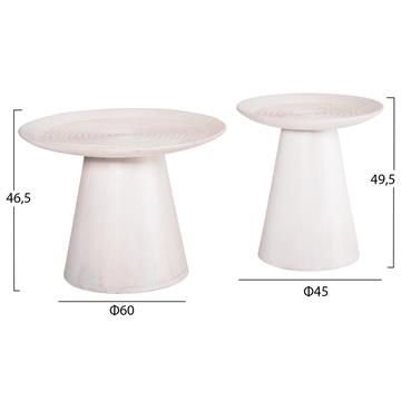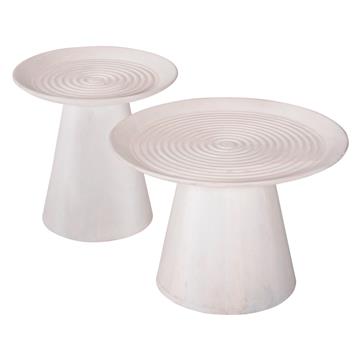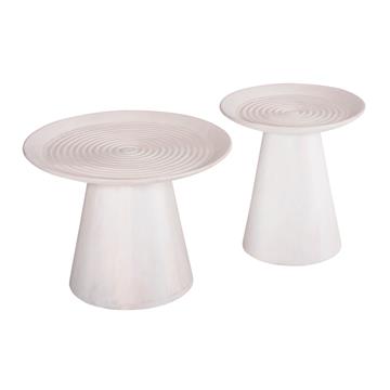 Το σετ στρογγυλών τραπεζιών σαλονιού ROSS αποτελείται από 2 τραπέζια εξολοκλήρου κατασκευασμένα από μασίφ ξύλο mango σε ΛΕΥΚΟ χρώμα και έχουν κωνικό σχήμα βάσης και καταλήγουν στην στρογγυλή επιφάνεια με μορφή πιατέλας. Ένα σετ που θα εντυπωσιάσει με το σχήμα και την πρακτικότητά του.