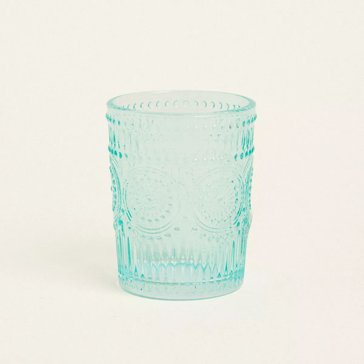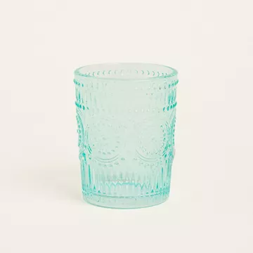 Γυάλινο ποτήρι με ανάγλυφο σχέδιο σε βεραμάν απόχρωση ( 8 x 10 cm), ιδανικό για να σερβίρετε νερό ή ποτό. Συνδύασε το με τα υπόλοιπα προϊόντα της κατηγορίας για ένα ολοκληρωμένο art de la table.